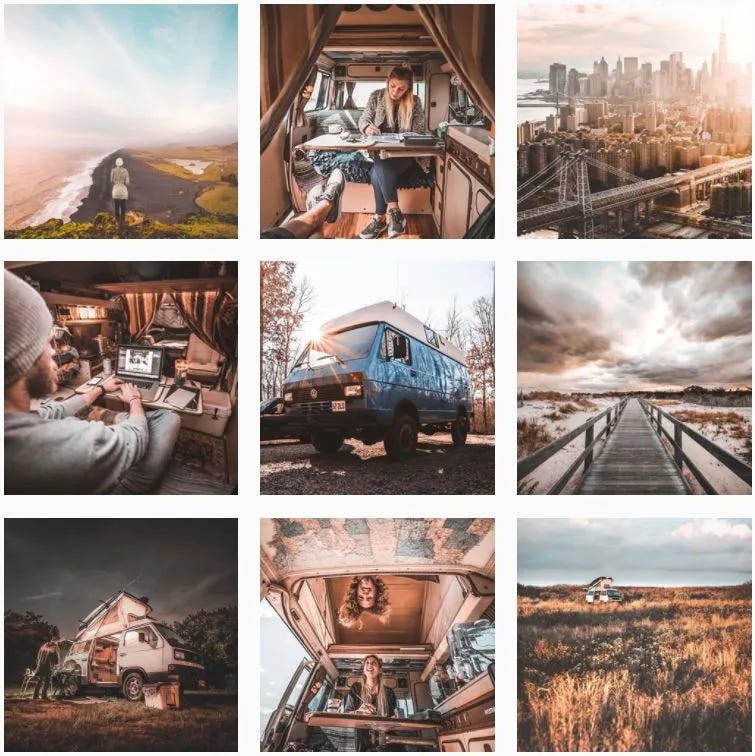 Rachel Monroe documented that distance up close in a 2017 New Yorker profile of two of vanlife’s most visible creators, a couple named King and Smith. Monroe watched their Instagram feed transform in real time, scrolling chronologically as what she described as “a life” became “a life-style brand.” Early posts were blackberries and sunsets. Later posts were optimized for engagement: the algorithm rewarded certain compositions over others, and the couple learned to give the algorithm what it wanted. Behind the images was the labor of producing them. Monroe describes more than seventy emails exchanged with a television network over a single sponsored Instagram post, and over thirty minutes spent staging a photo of King appearing to read a book with a branded laptop decal visible in the frame. Smith directed from the front seat: “Lift your head up a little bit more, look like you’re reading.” Then the post went up. The comments read: “Such a beautiful lifestyle.” “This looks like heaven.” The work of making effortlessness look effortless was invisible to everyone consuming it.