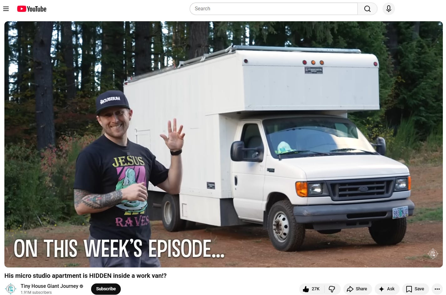 The man in it, Jake, lives full-time in a 2004 Ford E350 box truck. From the outside it looks like any contractor’s work van, white and forgettable, the kind of vehicle you glance past in a parking lot without registering it exists. That is by design. He keeps a neon safety vest draped over the passenger seat and a white hardhat visible through the windshield. When he pulls into a city block and people give him the side-eye, they see the vest, see the hat, and move on. Nobody thinks twice. Nobody knows that behind the cab, through a pass-through door he checks before opening to make sure no one is watching, there is a full-size bed, a hot shower, a composting toilet, a kitchen with an air fryer and a cast iron on an induction top, a music production studio, a closet with actual hanging space, two skylights, 500 watts of solar on the roof, and 55 gallons of fresh water. His dog Molly has her own spot on the couch.