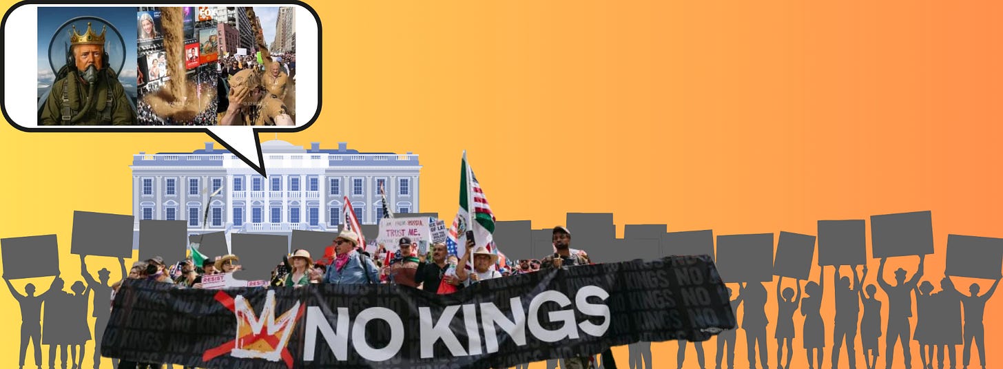 On October 18, 2025, seven million Americans marched against a fantasy. Across 2,700 cities, the “No Kings” protests filled streets with the most ordinary image of civic faith left to us — people walking together, believing that visibility still matters. Within hours, the White House answered with its own image: an AI video of Trump in a crown, piloting a fighter jet, dropping excrement on the protesters below.
