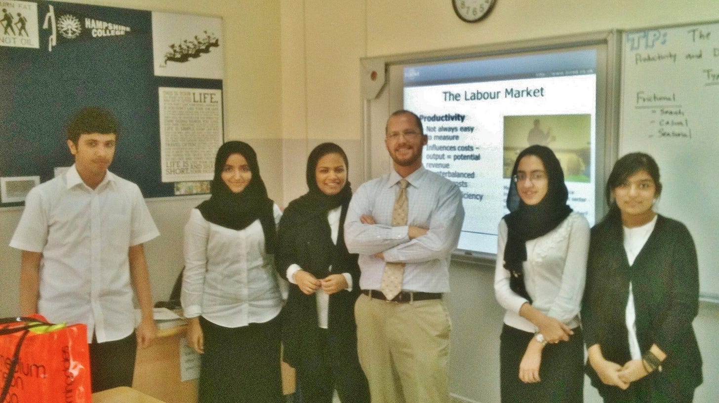 I have a photo from 2013 which shows my AS-Level Economics class at The English Modern School in Doha. Five Qataris, one Sri Lankan, one Iranian. Behind us, a Hampshire College pennant on the wall and “The Labour Market” on the projector. I posted it to Facebook on March 2nd with the following caption: “Out of all 150 students I teach these ones are by far the brightest and most engaged.”
