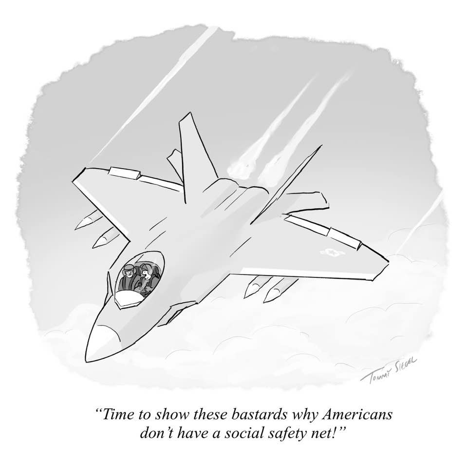 There’s a cartoon making the rounds on social media: a fighter jet soaring overhead, caption reading, “Time to show these bastards why Americans don’t have a social safety net!” It’s funny until you do the math.