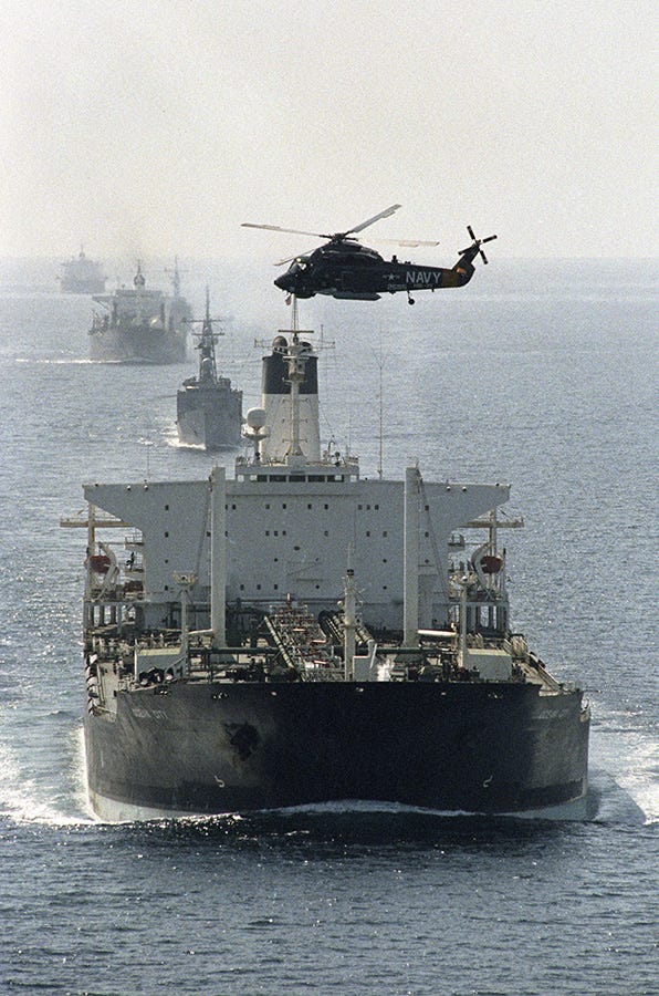 Iraq struck first, targeting Iranian oil tankers and the crucial loading terminal at Kharg Island. Iran retaliated by hitting Kuwaiti and Saudi tankers, since both nations backed Iraq. The escalation was deliberate. Iraq’s calculation was strategic: by attacking neutral shipping, it would force international intervention, which was precisely what Iraq needed because it could not win the war on its own. It worked. The United States reflagged Kuwaiti tankers under the American flag and sent warships to escort them through the strait. The Soviet Union volunteered to do the same. The chokepoint had done what it always does: it turned a regional war into a global crisis, because the world’s economy could not afford to let the passage stay dangerous.