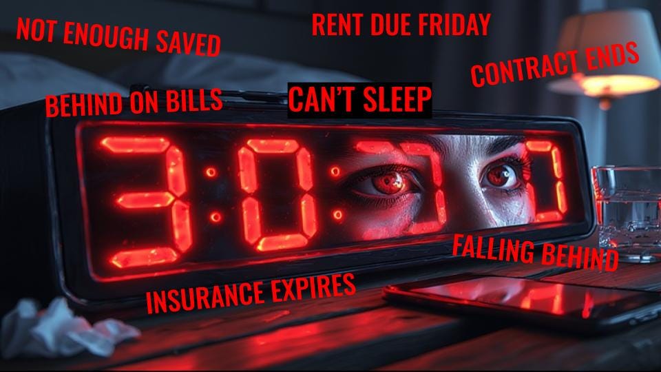 Eyes snap open. Heart already racing. The mental ticker tape begins: rent due Friday, health insurance expires next month, contract ends in December, haven't saved enough, never save enough, falling behind, always behind, relationships are crumbling, never going to get ahead, if I can’t sleep soon tomorrow will be awful.